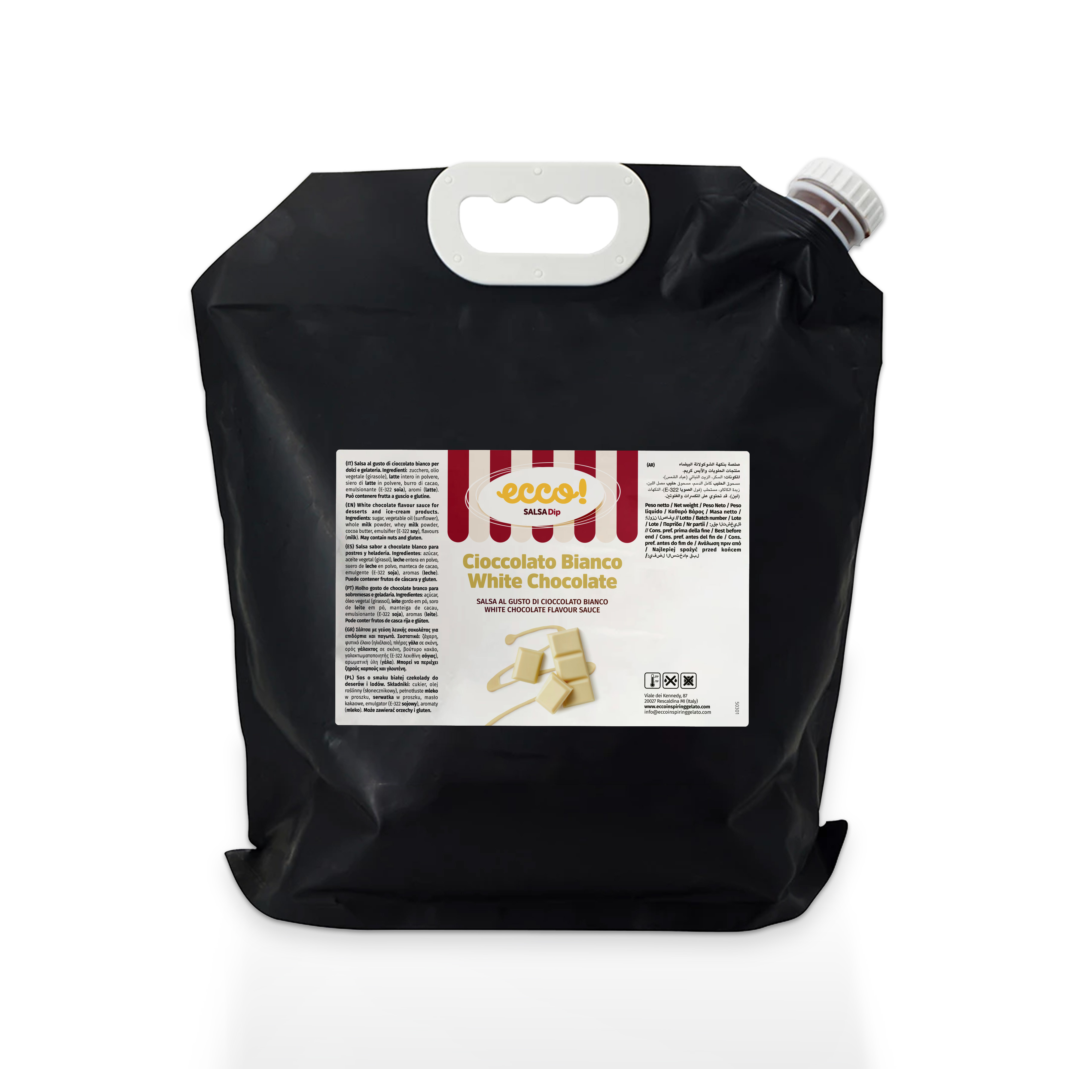 Hochwertige Soße/Sahne mit einem großartigen weißen Schokoladengeschmack. Viele Anwendungsmöglichkeiten für süße Produkte und Desserts. Diese Schokolade verfestigt sich nicht und behält daher ihren vollen Geschmack. Praktischer Vorteil bei der Verwendung ist, dass die Schokolade nicht erhitzt werden muss, um Bain-Marie oder Serviereinheit nachzufüllen.
